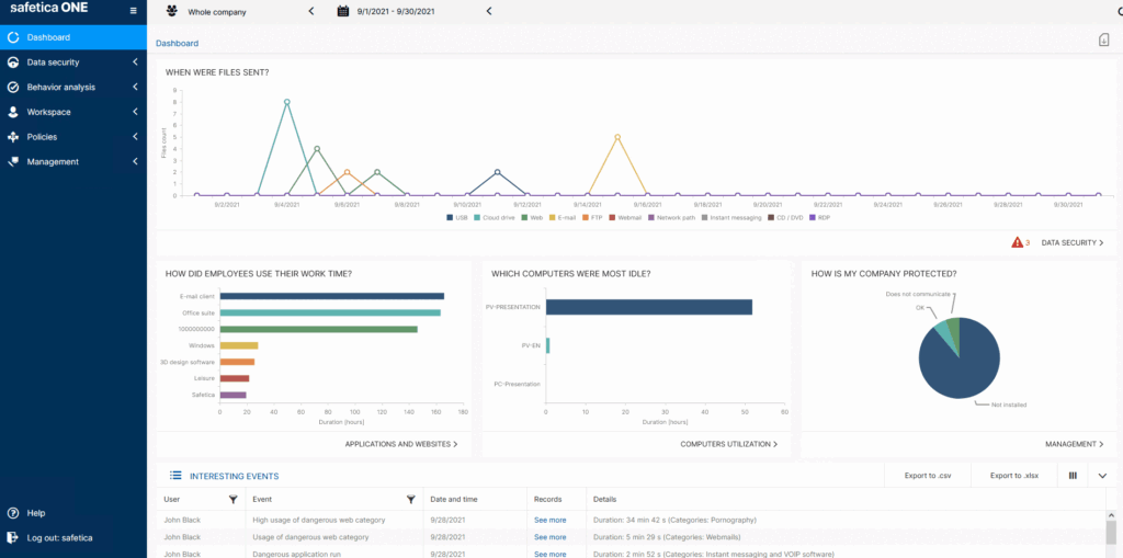 - Relatórios Detalhados e Análises: Desde já. o Safetica oferece relatórios detalhados e análises abrangentes sobre o uso e o movimento dos dados dentro da organização, fornecendo insights valiosos para aprimorar continuamente suas políticas de segurança.